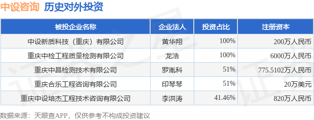 本站消息,根据天眼查APP显示,中设咨询(920873.BJ)新增一起对外投资事件,被投资公司为中设新质科技(重庆)有限公司中博证券,法定代表人黄华翔,投资占比为100%。该公司从事专业技术服务业,注册资本为200万人民币。目前,中设咨询共存在对外投资5项,详见下表: