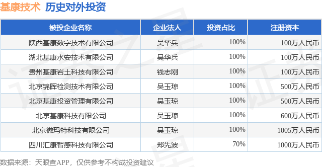 本站消息金配资,根据天眼查APP显示,基康技术(920879.BJ)新增一起对外投资事件,被投资公司为陕西基康数字技术有限公司金配资,法定代表人吴华兵,投资占比为100%。该公司从事科技推广和应用服务业,注册资本为100万人民币。目前,基康技术共存在对外投资8项,详见下表: