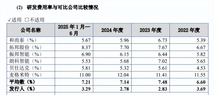研发费用率在同行中垫底。报告期内,拓普泰克研发费用分别为2,099.09万元、2,186.66万元、2,880.57万元、1,870.88万元,研发费用率分别为3.69%、2.83%、2.78%、3.29%。