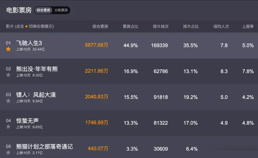 一个是钉子户《熊出没》,票房破10亿了,还有一部是毫无疑问的大赢家《飞驰人生3》,票房超过了33亿,比其他电影加起来还要高。