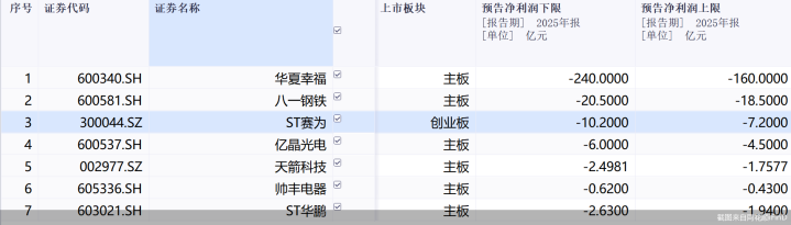 在天箭科技、帅丰电器外的5股中,华夏幸福全年净利预亏规模居首,公司预计亏损160亿—240亿元;年度净利预亏下限超10亿元的还有八一钢铁、ST赛为2股,其中八一钢铁全年净利预亏18.5亿—20.5亿元;ST赛为全年预计亏损7.2亿—10.2亿元。另外,亿晶光电2025年净利预亏4.5亿—6亿元;ST华鹏净利预亏1.94亿—2.63亿元。